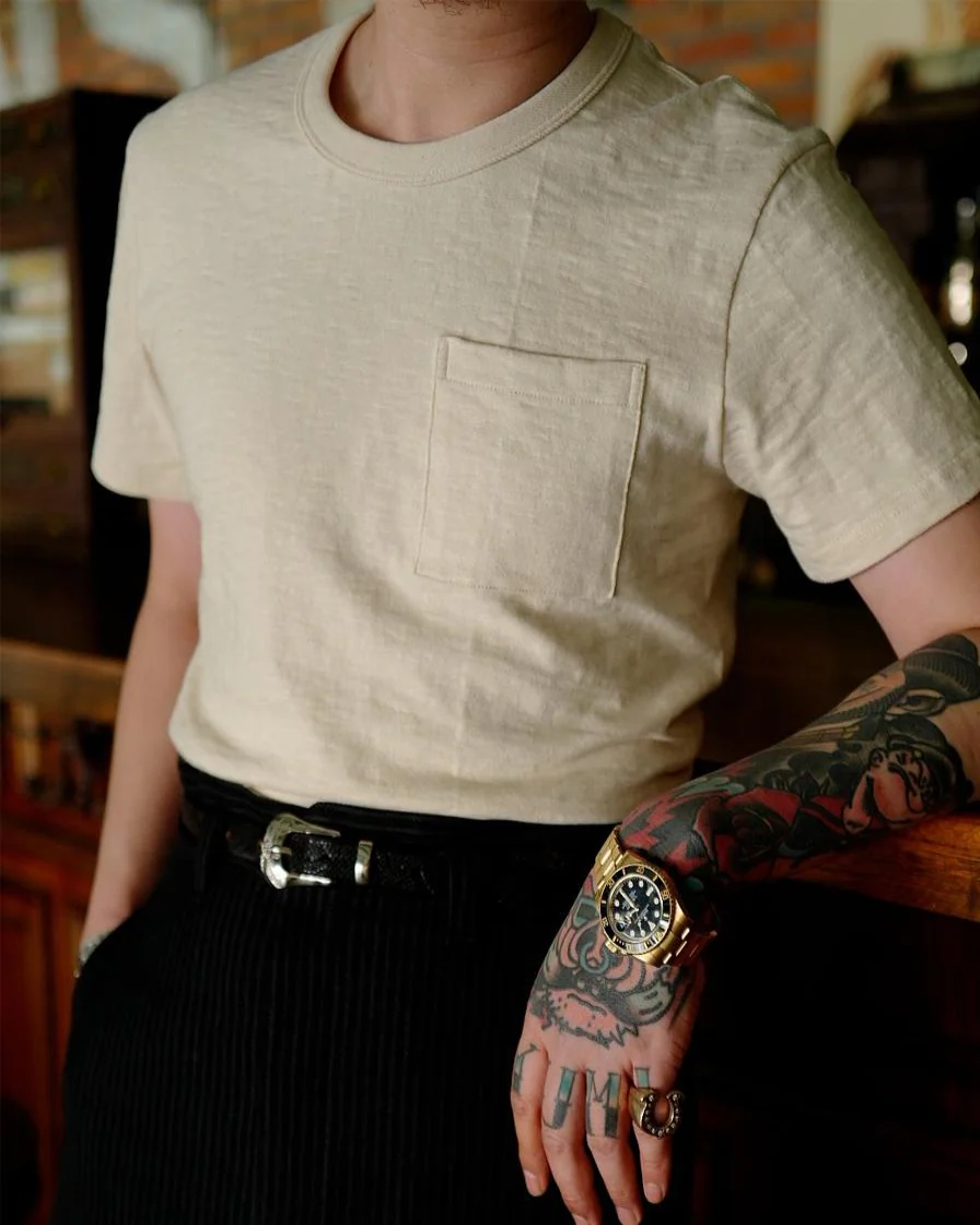 We have created the all-purpose 1950s-style shirt for you. This short-sleeve men's round-neck shirt with a patch pocket on the chest is made from organic cotton slub yarn. It is worth mentioning that the traditional Tubular Knit makes this shirt keep shape after washing.
