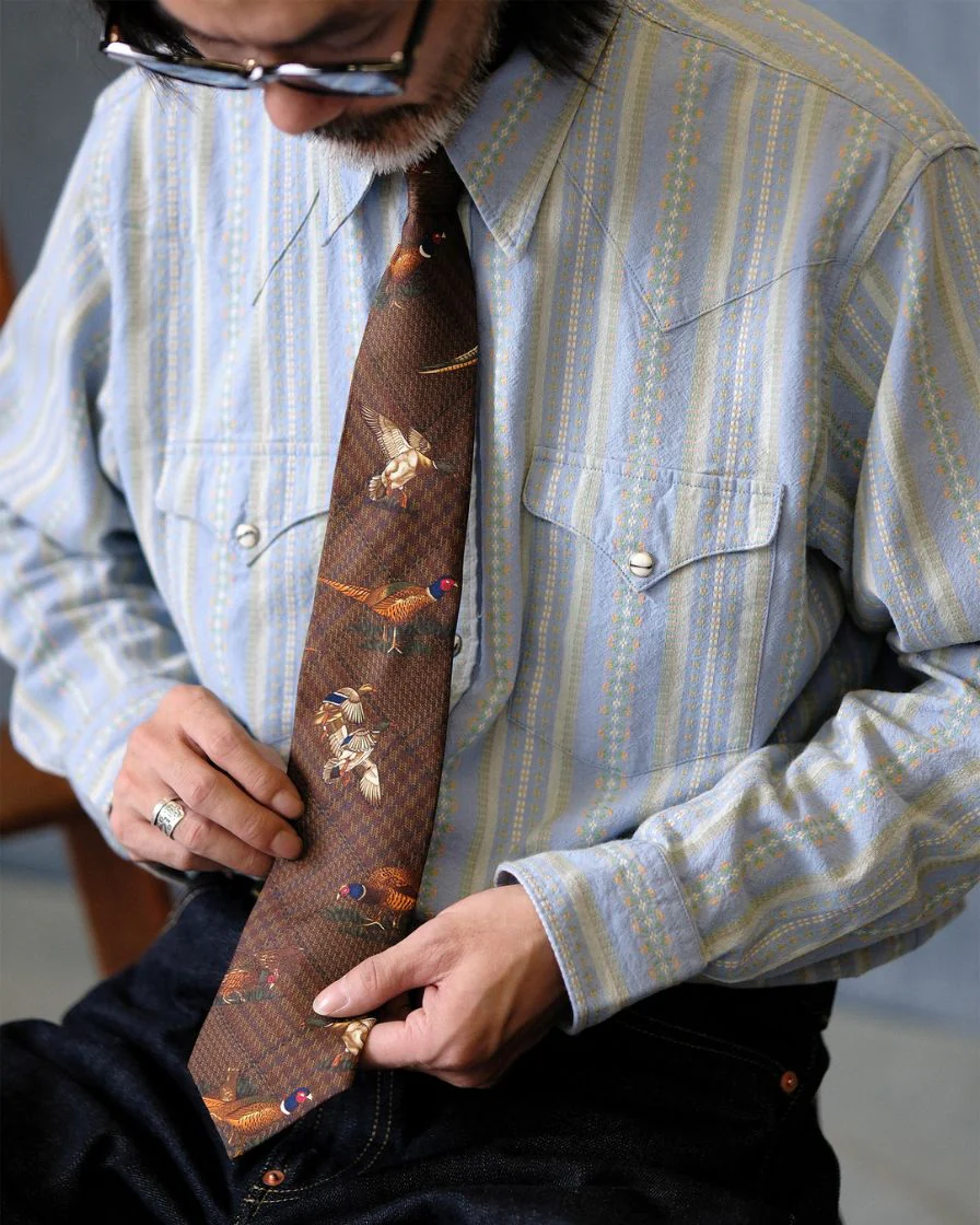 Embodying authentic 1960s style, this wide-head tie features a refined plaid pattern accented with classic game bird motifs, evoking a timeless hunting heritage.