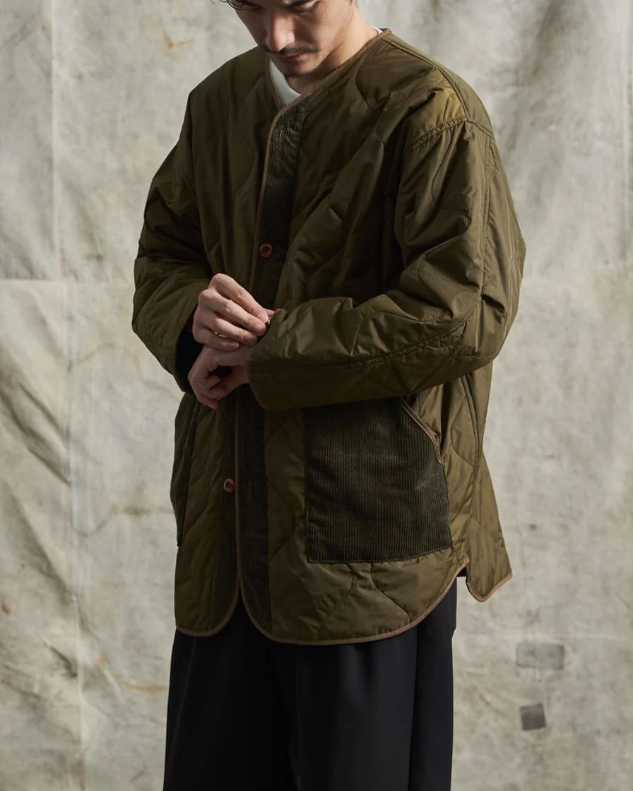 Constructed from corduroy reinforcing the edge and ripstop filled with cotton to function as the thermal insulator, we had great fun designing this spliced liner overshirt.