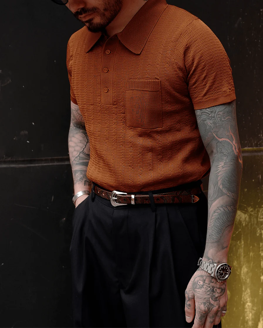 This series of polo shirts took inspiration from the movie 'Green Book', covering classic Ivy style to Italian elegant Knit polo. We are proud to offer you this timeless rusty polo shirt which is worth a dig. Classic 60s spread collar matching with four buttons collar, matching pattern pocket with threaded flap, all details speak for itself, telling us the golden era it is from and how detailed this garment is. This could be your unparalleled wardrobe stamp.