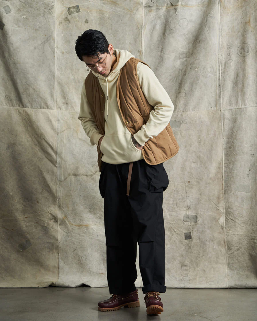 The vest itself is packed full of useful features such as two hands warmer pockets and a line of snap buttons. Cut from quilted cotton, this piece is lightweight and adds a touch of warmth. The khaki color and oversize cut create a casual and vintage style.